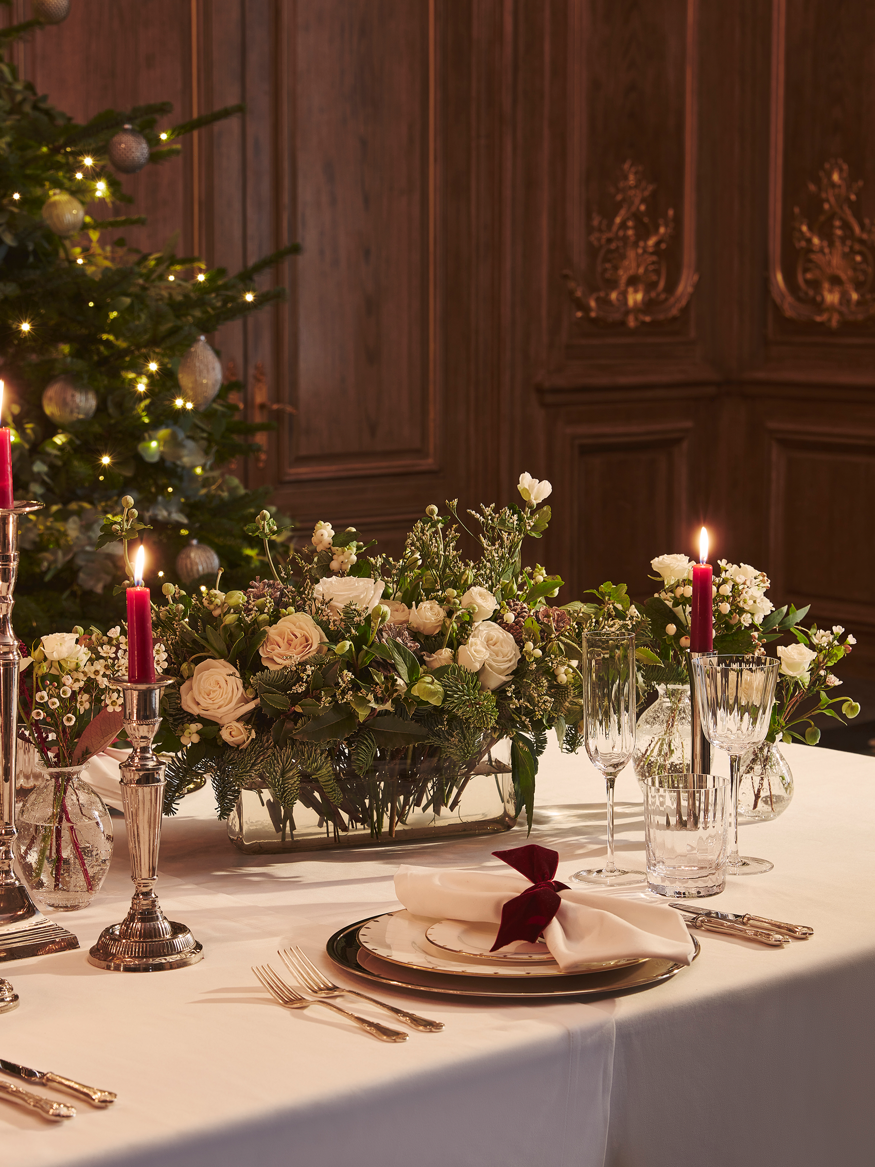 Claridge’s Flowers creates exquisite Christmas installations designed to transform venues, hotel rooms and private residences for the festive season. From magnificent trees and sweeping garlands to opulent wreaths and candlelit tablescapes, each design is thoughtfully composed to evoke warmth, celebration and quiet grandeur.